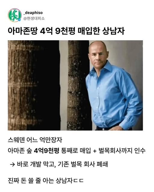 비회원 커뮤니티 0 7 3시간전 아마존땅 4억 9천평을 매입한 스웨덴 갑부 출처 : https://m.bboom.naver.com/best/get?boardNo=9&postNo=4352782 이 글을 SNS로 공유하기