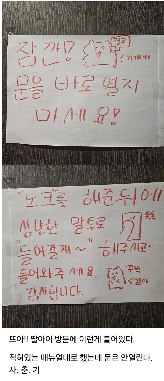 비회원 커뮤니티 0 1 3시간전 사춘기 딸이 붙여놓은 경고문.jpg 귀여워 ㅋㅋㅋㅋㅋㅋㅋㅋㅋㅋ 출처 : https://m.bboom.naver.com/best/get?boardNo=9&postNo=4360448 이 글을 SNS로 공유하기