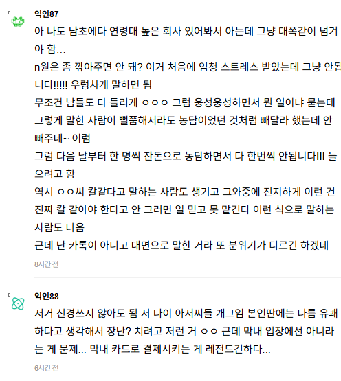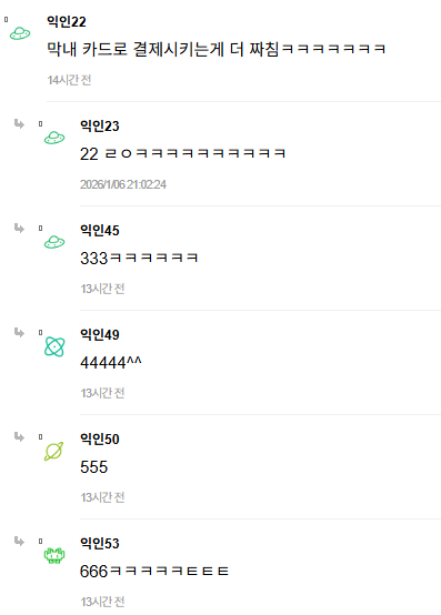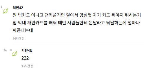 비회원 커뮤니티 0 6 9시간전 카톡 정산하기 기능의 부작용 막내 카드로 저러는게 졸라 짜침; 출처 : https://m.bboom.naver.com/best/get?boardNo=9&postNo=4359052 이 글을 SNS로 공유하기