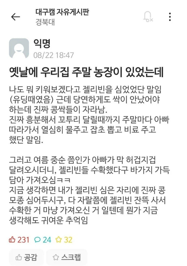 비회원 커뮤니티 0 6 7시간전 농장에 젤리빈 심은 썰.jpg 귀여운 가족 ㅎㅎㅎㅎ 출처 : https://m.bboom.naver.com/best/get?boardNo=9&postNo=4360493 이 글을 SNS로 공유하기
