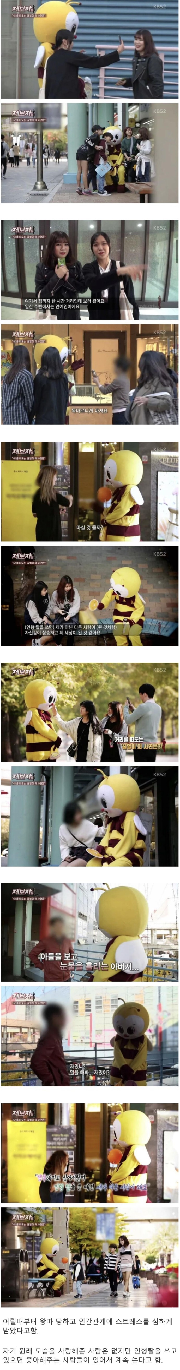비회원 커뮤니티 0 6 3시간전 길거리 떠도는 ‘꿀벌’ 인형탈 사연 출처 : https://m.bboom.naver.com/best/get?boardNo=9&postNo=4351389 이 글을 SNS로 공유하기