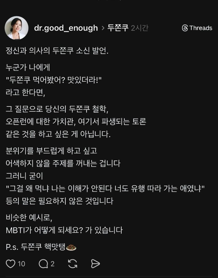 비회원 커뮤니티 0 6 12시간전 정신과 의사의 두쫀쿠 소신 발언 진짜 맞음... 출처 : https://m.bboom.naver.com/best/get?boardNo=9&postNo=4362243 이 글을 SNS로 공유하기