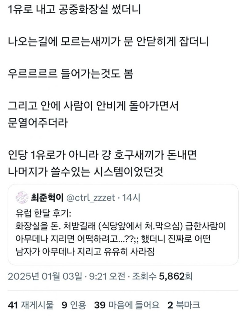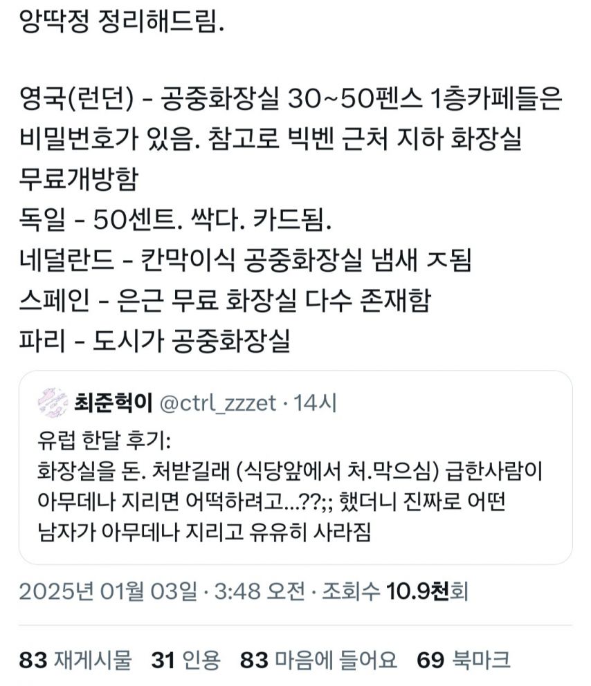 비회원 커뮤니티 0 1 5시간전 유럽 한달 후기 화장실 유료 출처 : https://m.bboom.naver.com/best/get?boardNo=9&postNo=4352173 이 글을 SNS로 공유하기