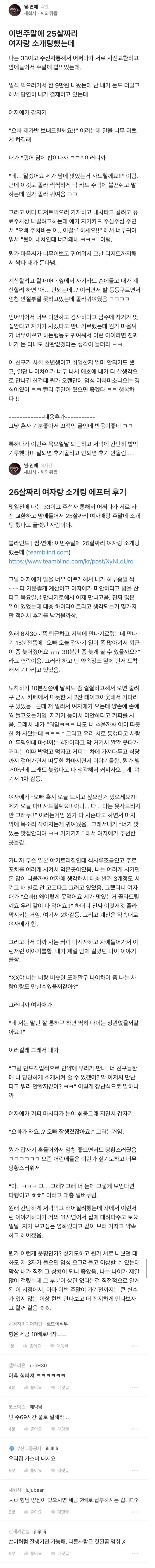비회원 커뮤니티 0 2 3시간전 25살여자와 소개팅한 33살 남자 20대입장ㄷㄷㄷ 출처 : https://m.bboom.naver.com/best/get?boardNo=9&postNo=4362868 이 글을 SNS로 공유하기