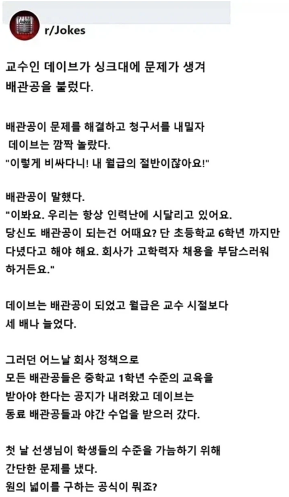 비회원 커뮤니티 0 9 02.28 17:00 교수가 배관공으로 전직했다 다들 교수셨어요?ㅋㅋㅋㅋㅋㅋㅋㅋㅋㅋ 출처 : https://m.bboom.naver.com/best/get?boardNo=9&postNo=4366204 이 글을 SNS로 공유하기