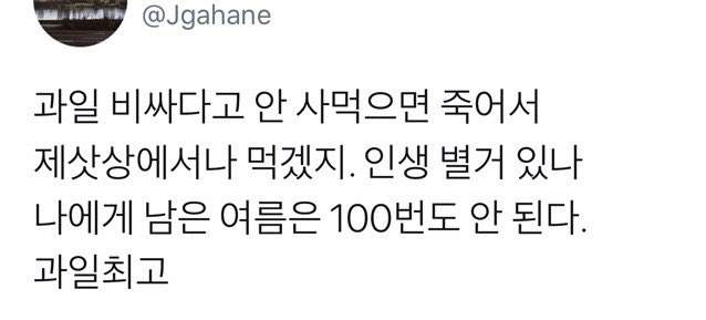 비회원 커뮤니티 0 0 2시간전 과일 잘 챙겨먹자 비싸다고 안 사먹었다가 괜히 나중에 지구온난화든 뭐든 과일 멸종되면 어떡해 그냥 지금 먹자 출처 : https://m.bboom.naver.com/best/get?boardNo=9&postNo=4366724 이 글을 SNS로 공유하기
